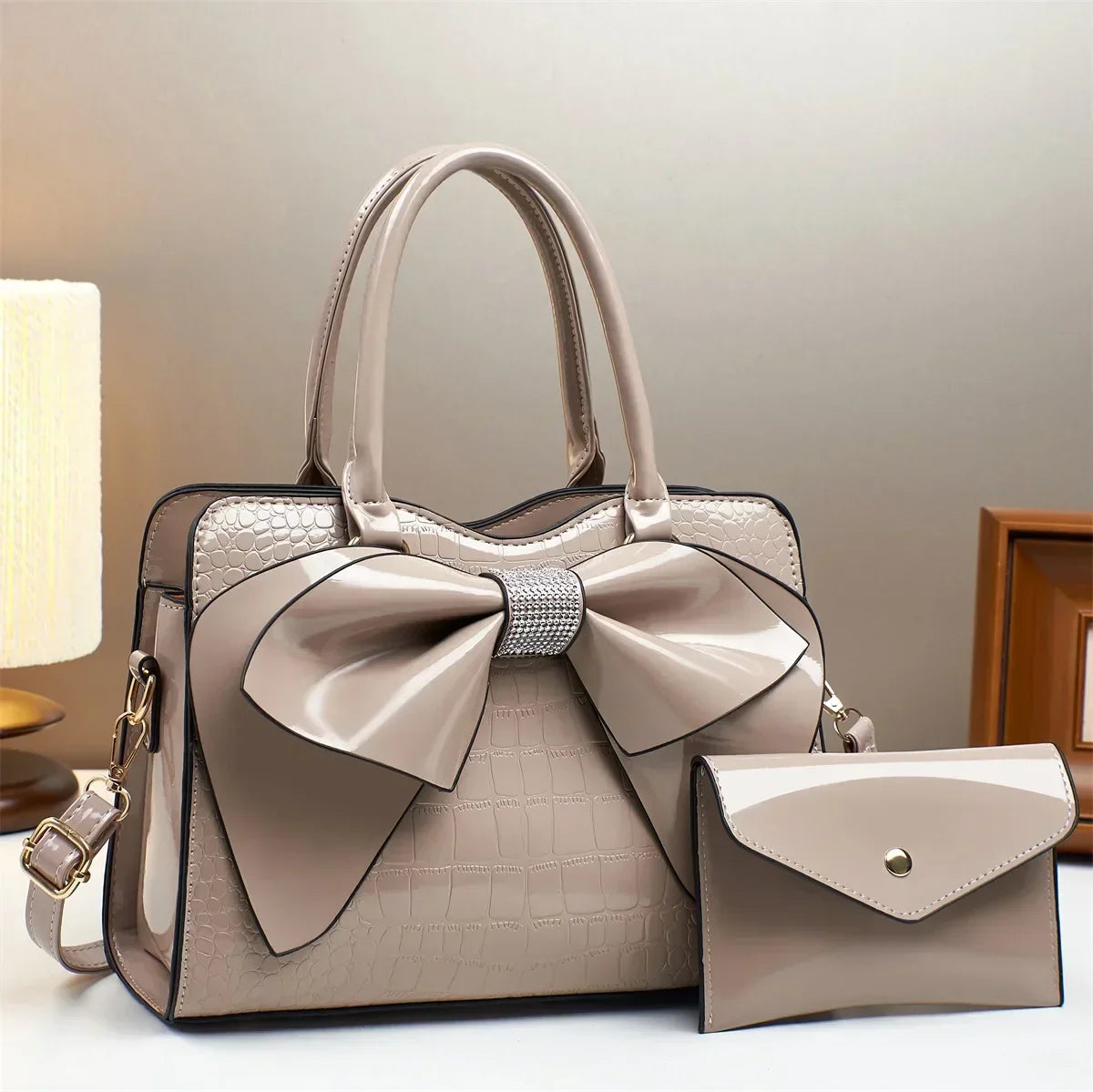 This women’s handbag set features a spacious main bag styled with a signature bow detail for a refined focal point. A matching clutch completes the set, offering flexibility for different occasions. The interior is softly lined and includes secure zippered compartments for organized storage. Balanced proportions make the bag suitable for carrying daily essentials while keeping the look polished. A versatile combination designed to blend practical use with distinctive charm.