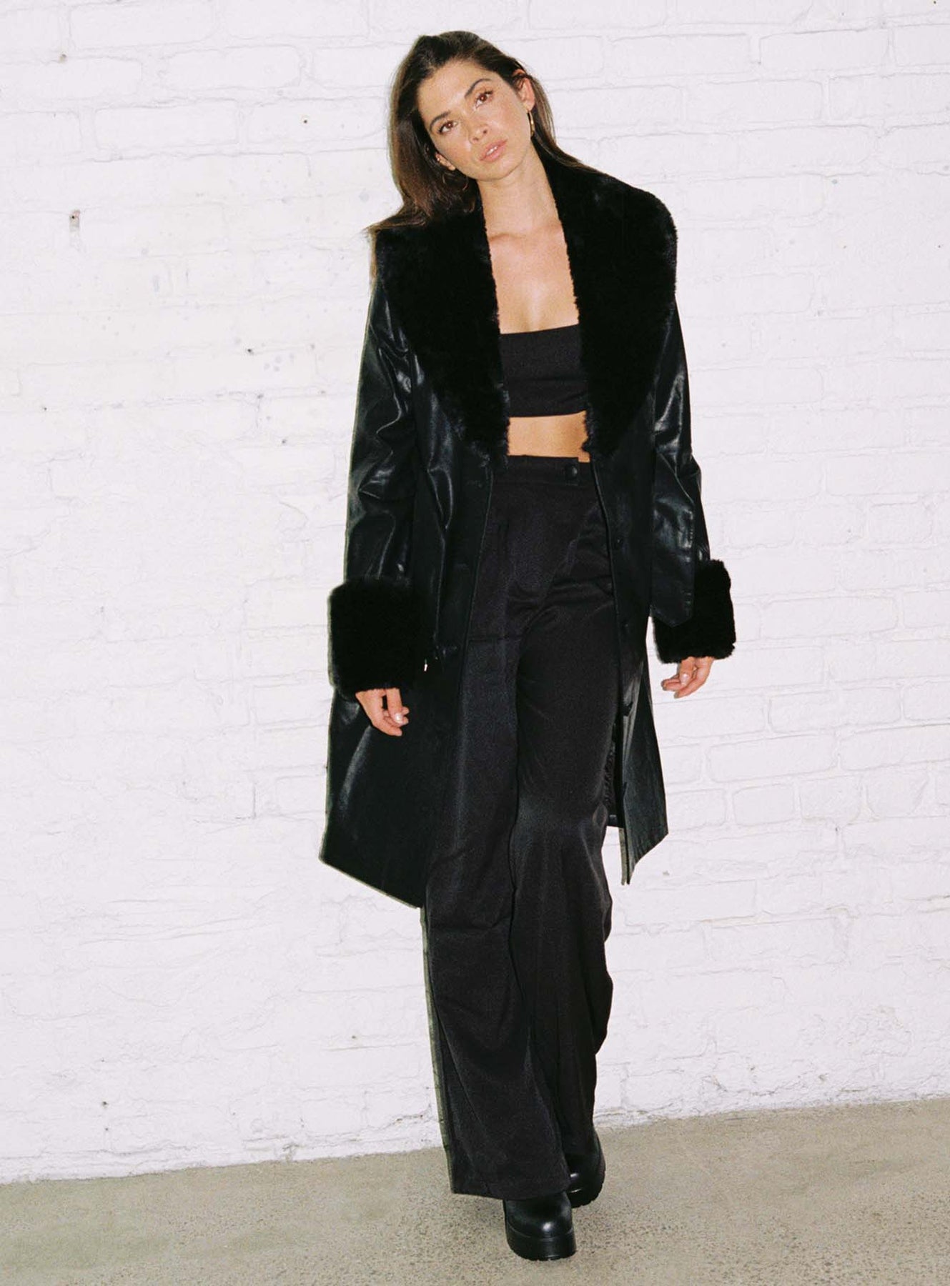 Kyla | Women’s long vegan leather coat with faux fur trim and waist belt