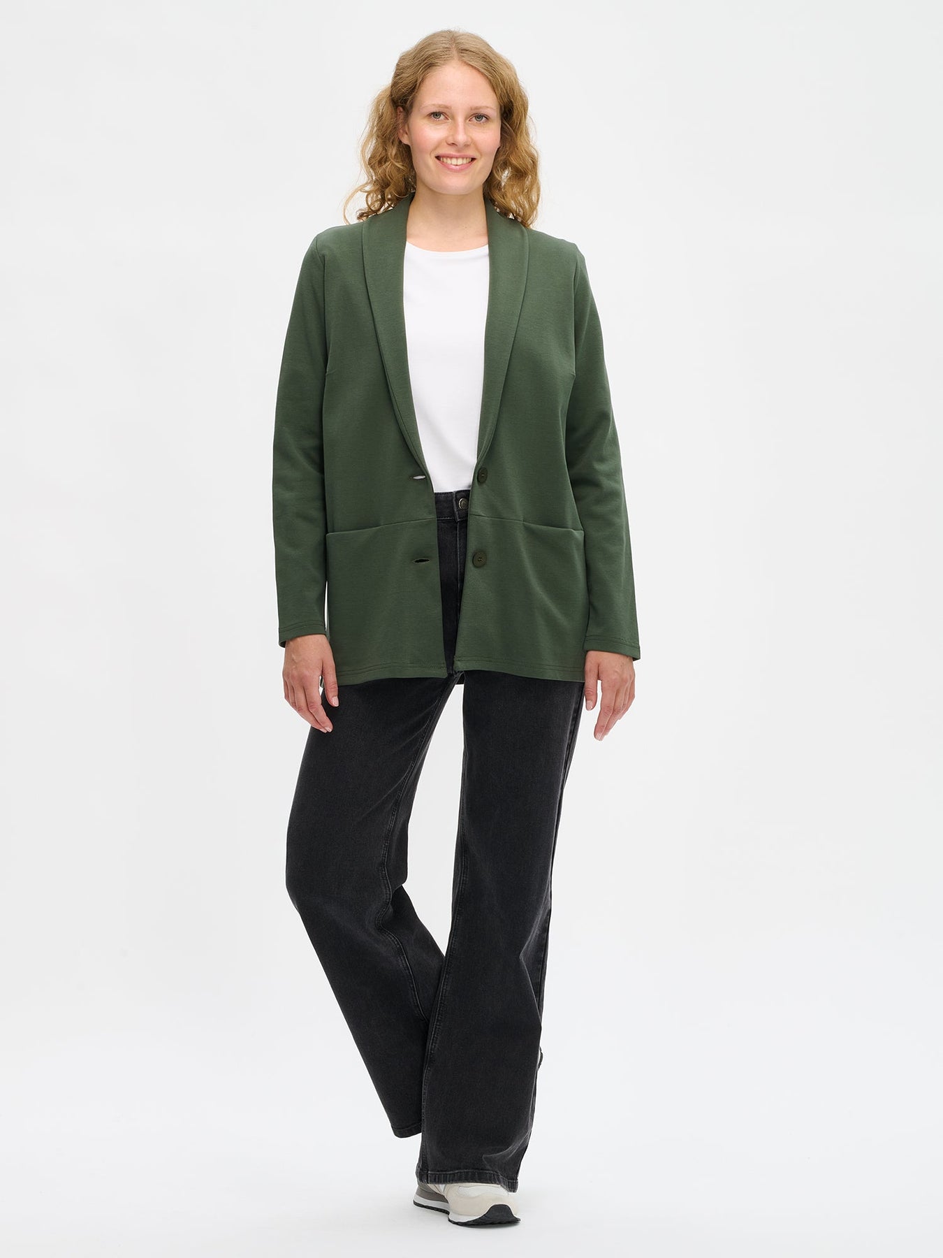 This women’s solid color tailored knit blazer combines comfort and sophistication in one versatile piece. Designed with a classic collar, button closure, and front darts for a flattering fit, it’s perfect for both casual and office looks. The blazer features long sleeves and subtle front seam pockets, crafted from a soft, thicker interlock knit fabric that feels smooth and structured.