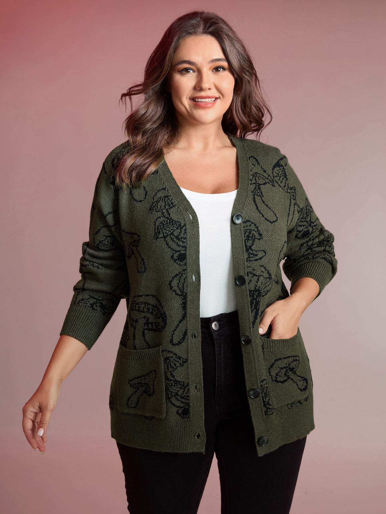 This women’s mushroom print button-front cardigan is the perfect mix of whimsy and warmth. Designed with a relaxed silhouette, it features drop shoulders, a deep V-neckline, front patch pockets, and button fastening for an effortless everyday style. The soft knit fabric keeps you cozy while the playful mushroom print adds a fun, distinctive twist to your seasonal wardrobe.