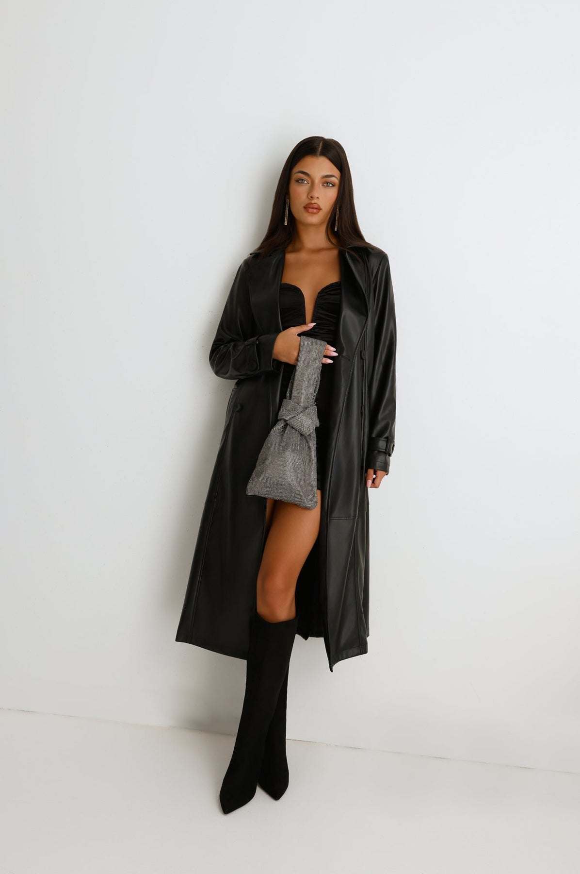 This wristlet bag is designed to dazzle with its shimmering rhinestone exterior and sleek silhouette. A chic gunmetal hardware detail adds a touch of edge, while the practical side zipper keeps your essentials secure. Compact yet eye-catching, this wristlet is perfect for evenings where you want to shine. Its unique knotted handle design makes it both trendy and functional. The perfect finishing touch to elevate any night-out look.