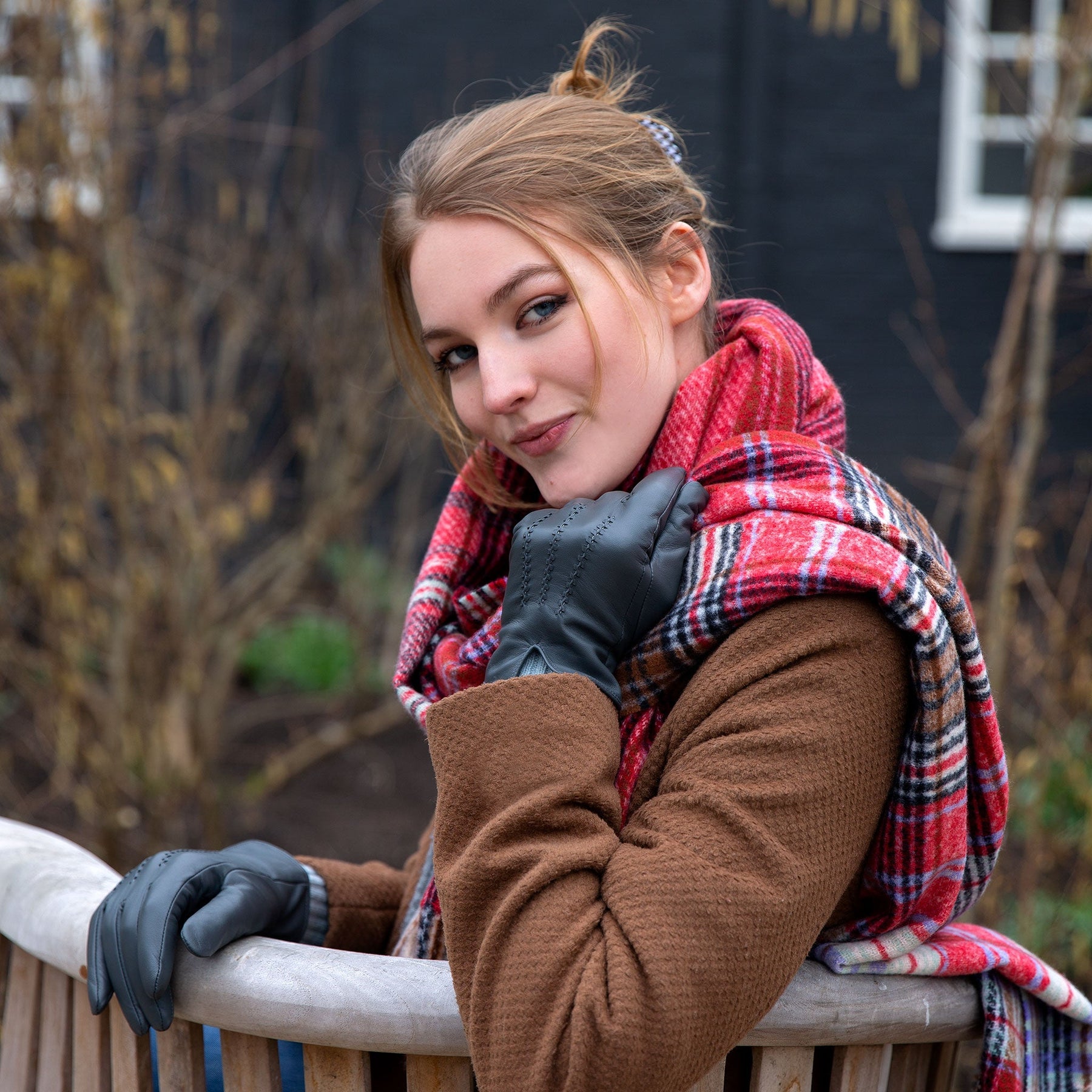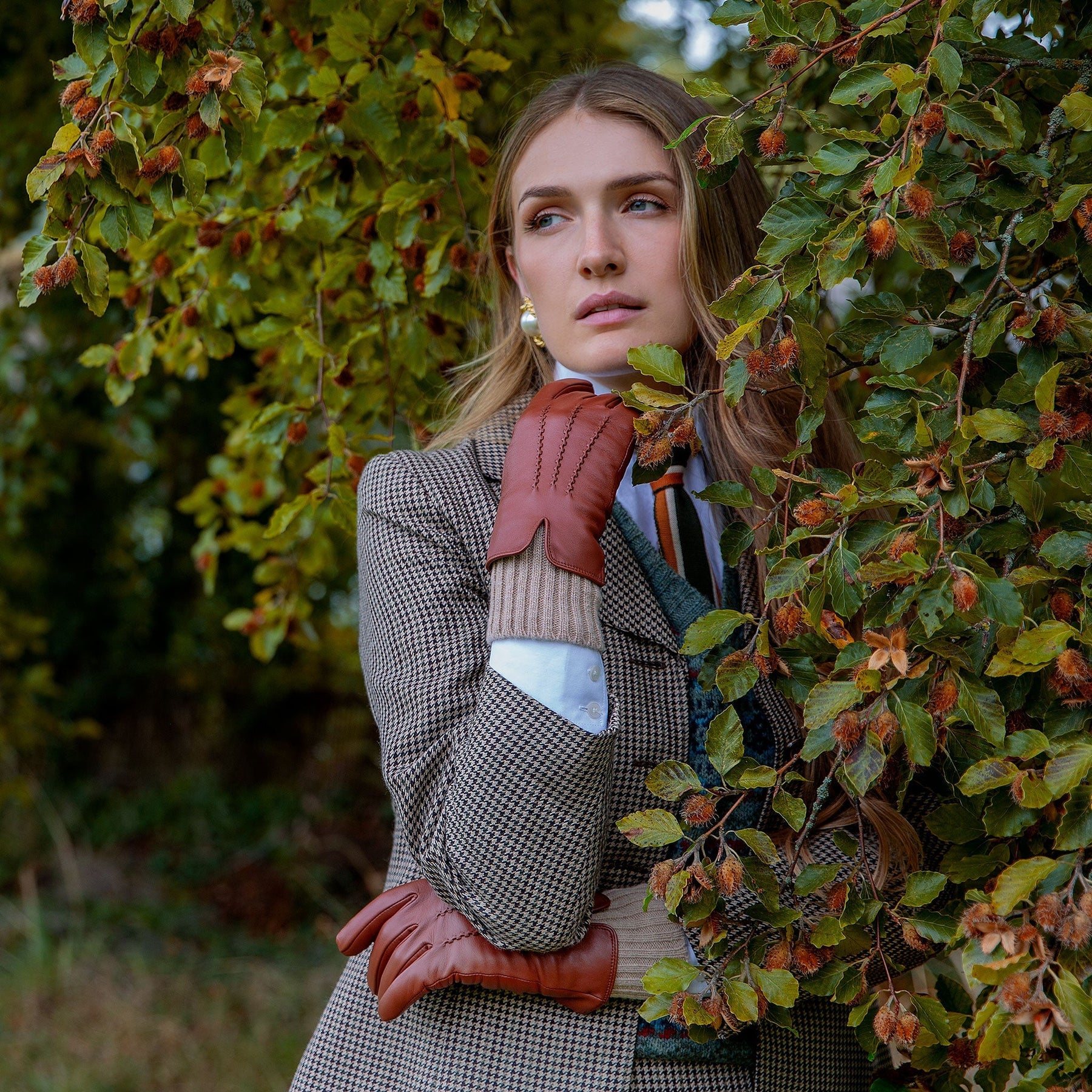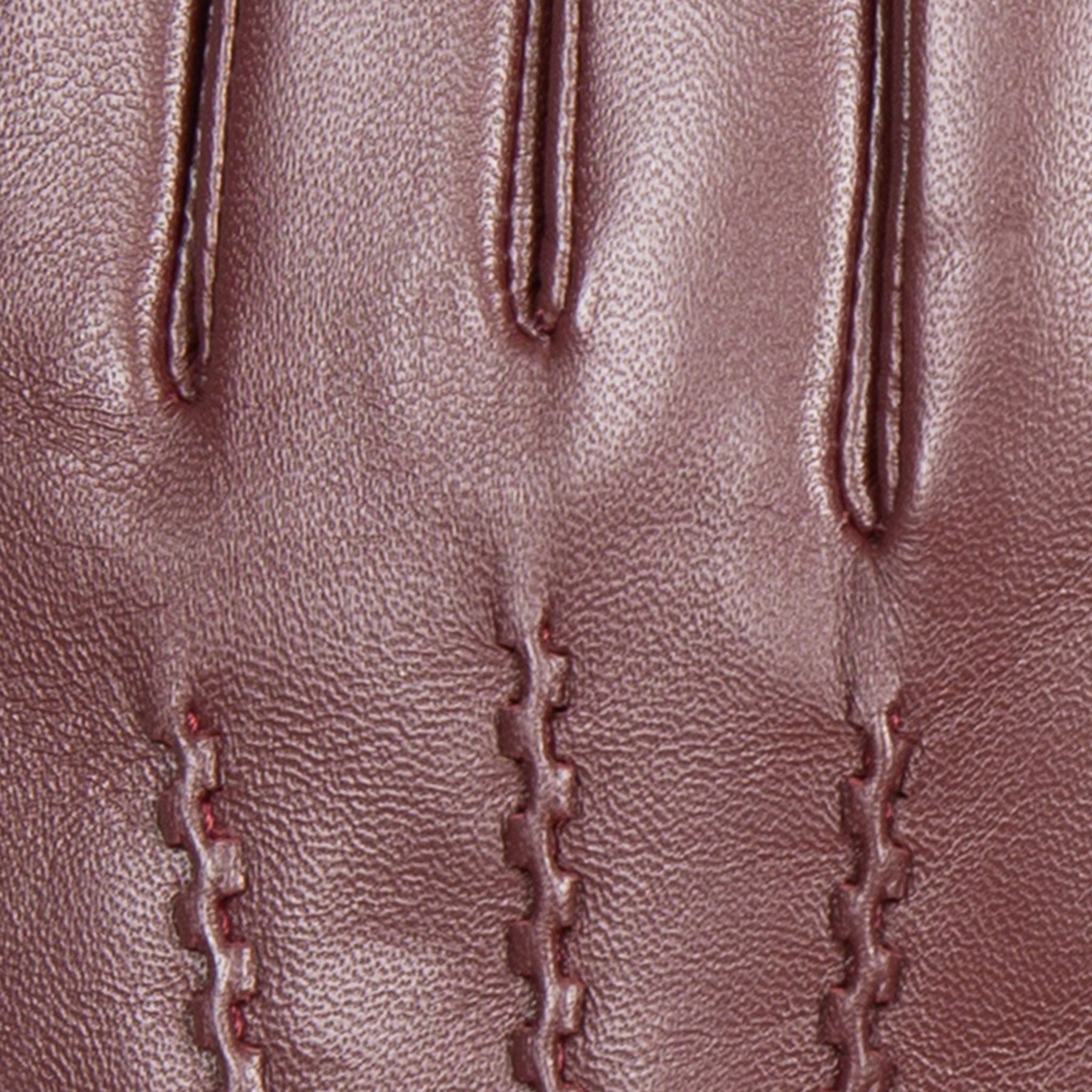 These women’s gloves feature a sleek burgundy finish with three-point stitched detailing for a refined touch. The ribbed knit cuffs extend beyond the wrist, keeping cold air out while adding subtle contrast. A soft wool-blend lining provides insulation throughout, making them a reliable choice for winter wear. With a streamlined fit and mid-arm length, these gloves pair easily with both coats and lighter layers.