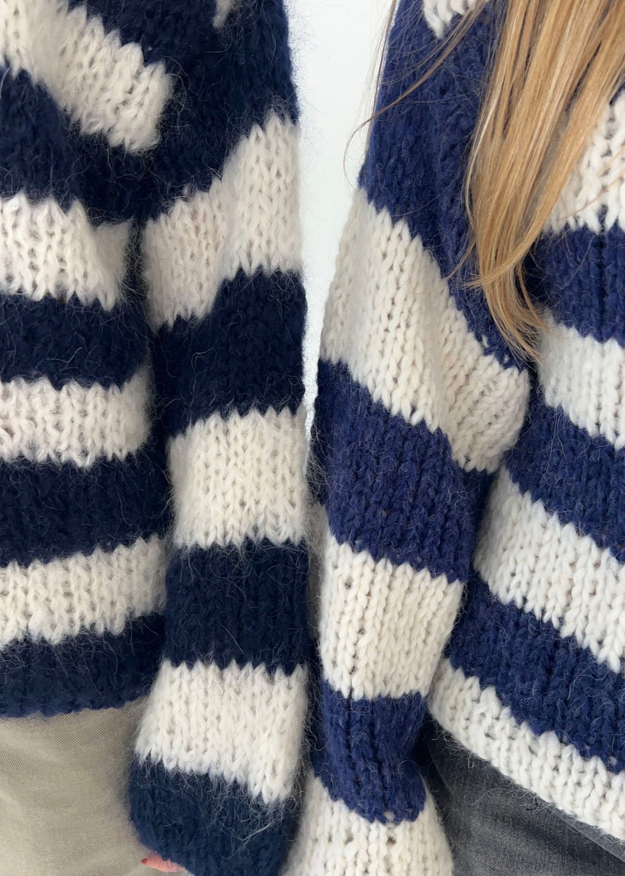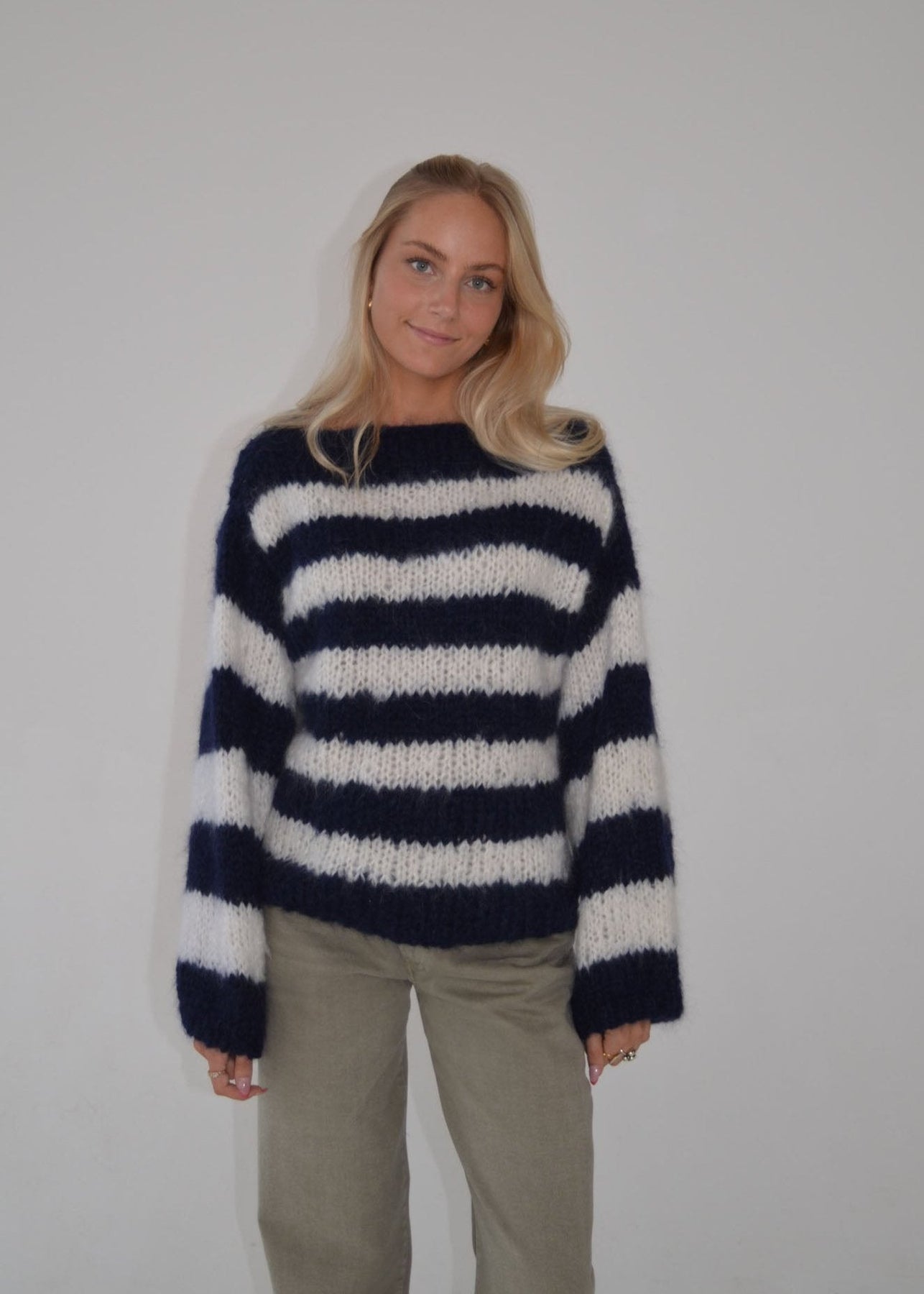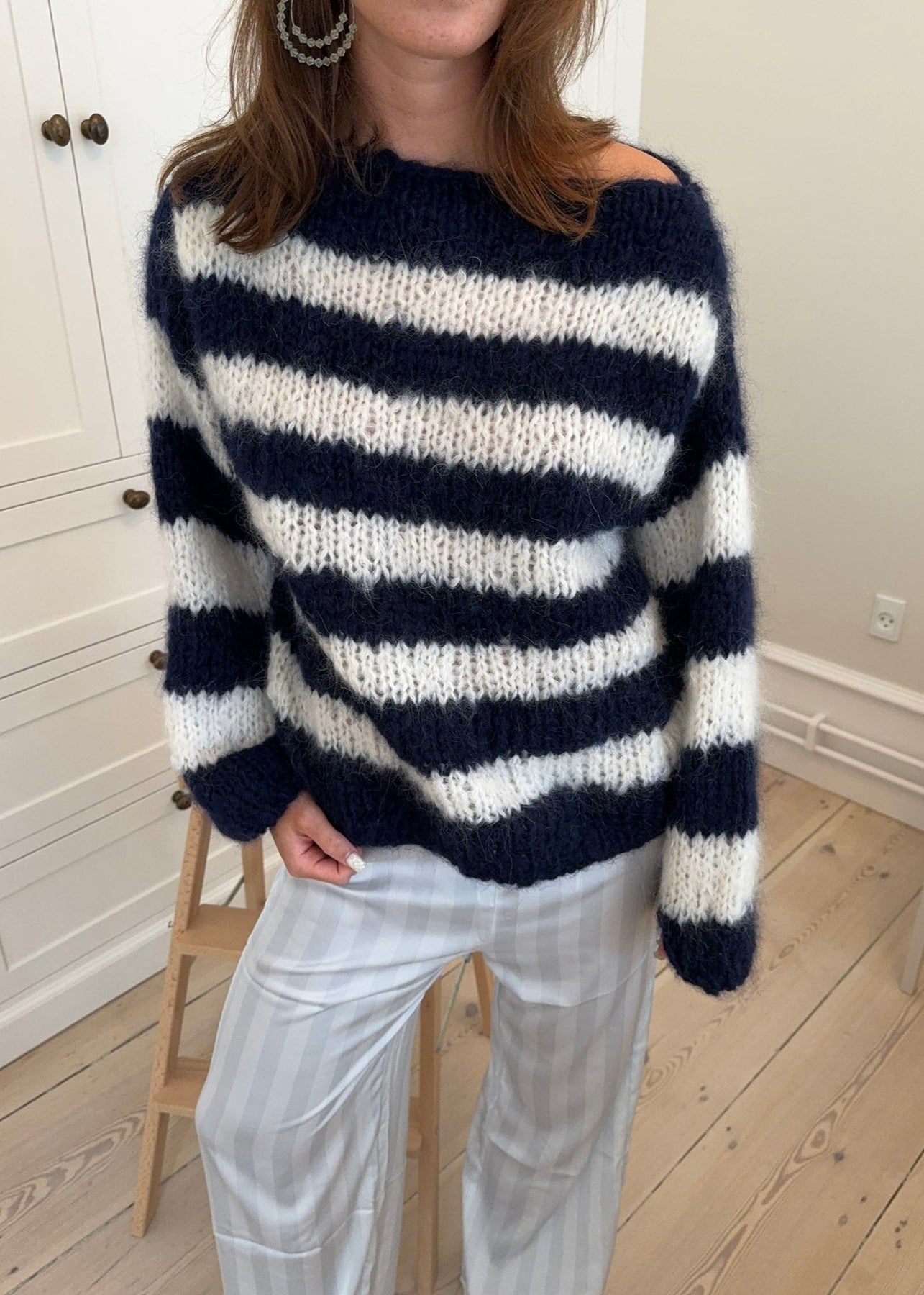 The Aurora sweater is styled with a boat neckline, ribbed edges, and set-in sleeves, giving it a balanced silhouette with a contemporary touch. Its versatile cut makes it suitable for layering or as a statement piece on its own, offering a look that feels both stylish and adaptable.