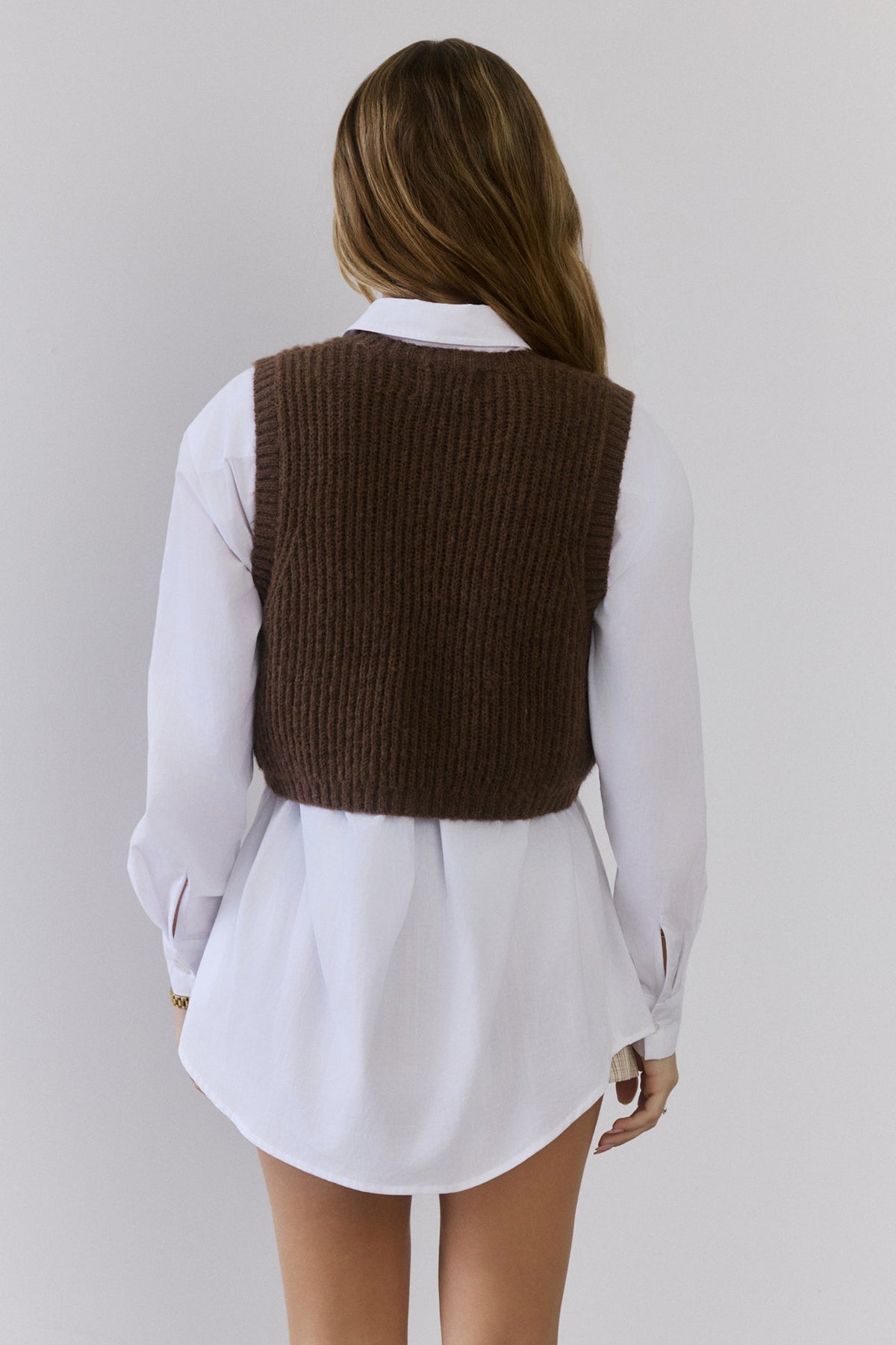 This knit vest features a button-front closure and cropped length, making it the perfect piece to layer over shirts or dresses. Its ribbed knit texture adds subtle dimension, while the soft, stretch fabric ensures an easy slip-on fit. Designed to bring a balance of structure and comfort, it’s a versatile addition to your wardrobe.