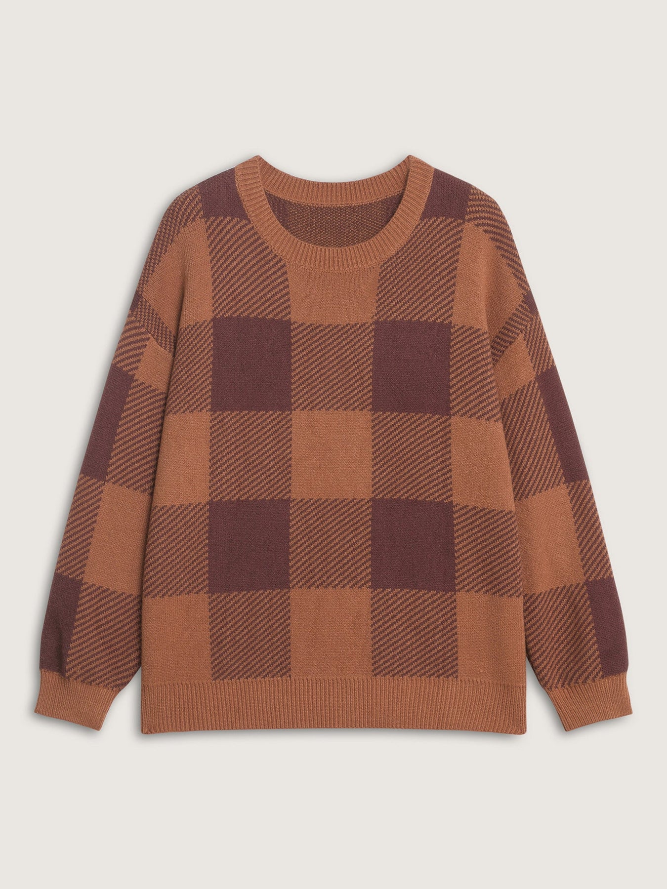 This women’s checked crew neck knit sweater brings a touch of classic charm to your everyday wardrobe. Crafted from soft, warm knit fabric, it offers a relaxed fit that’s perfect for layering on cool days. The timeless checked design adds visual interest, while the ribbed neckline, cuffs, and hem ensure a comfortable and polished finish. Pair it with jeans or skirts for a cozy yet stylish look that works from weekday to weekend.