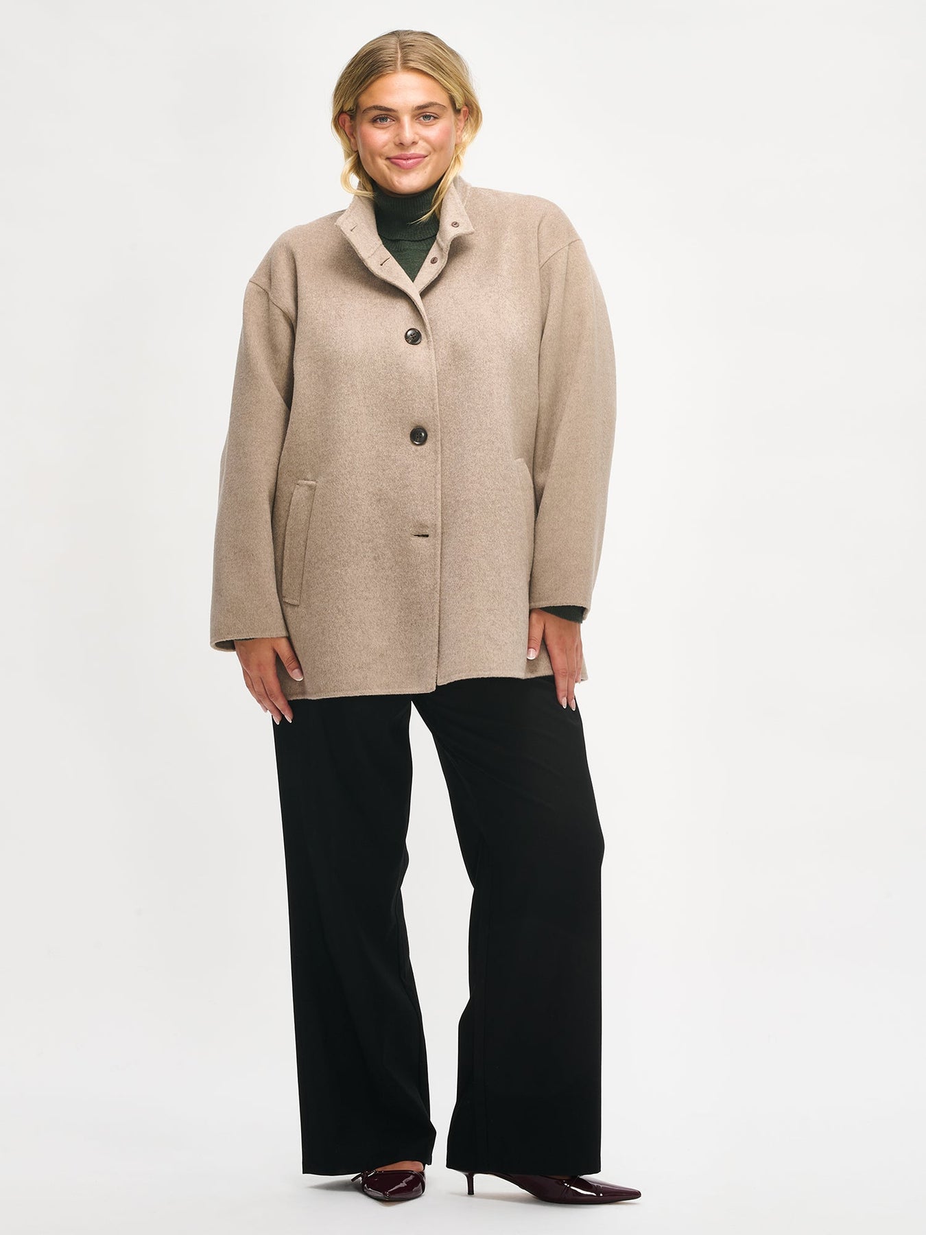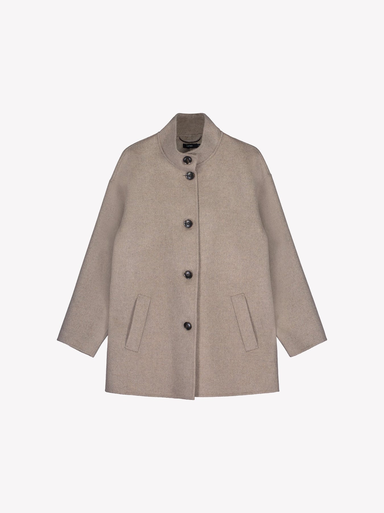 This women’s short wool-blend coat with a stand collar brings effortless sophistication to your wardrobe. Crafted from a high-quality wool-polyester blend, it offers warmth, structure, and refined style. The minimalist A-line silhouette and neat detailing make it versatile for both casual and formal occasions. Designed with button fastening and front welt pockets, it’s a chic outerwear essential that never goes out of style.