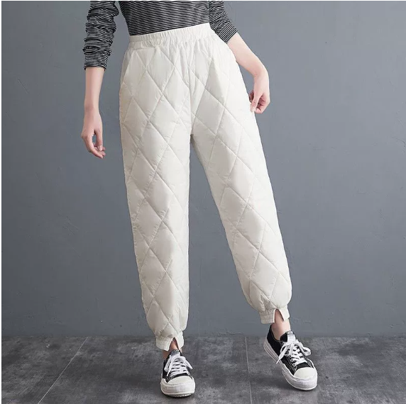 These quilted pants feature a diamond-stitched pattern that adds visual structure while keeping the silhouette soft and relaxed. The elastic waistband offers an easy, comfortable fit, and the gently tapered legs create a balanced line that gathers neatly at the cuffs. Their smooth, padded appearance makes them ideal for cool-weather layering without adding unnecessary bulk. Perfect for winter routines, they deliver a composed blend of warmth and everyday simplicity.