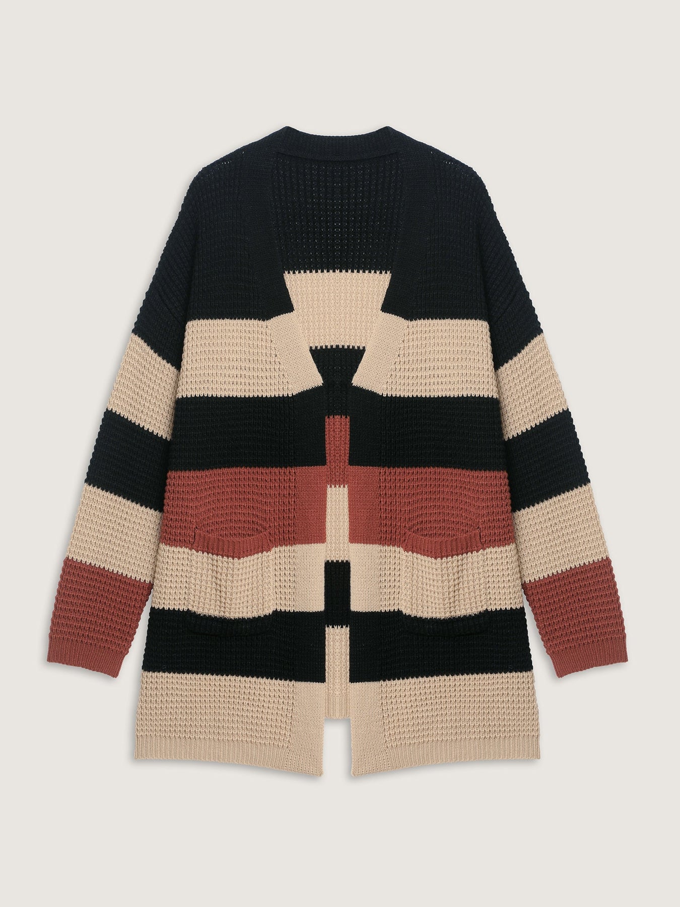 This women’s open-front knit cardigan combines comfort and contemporary flair with its wide striped design and relaxed silhouette. Crafted from a soft, textured knit, it’s perfect for layering over casual outfits, whether you’re heading out for a coffee date or enjoying a cozy day indoors. The longline cut offers extra warmth and coverage, while the front pockets add a functional touch. Pair it with jeans, shorts, or dresses for a stylish yet laid-back look that works through every season.