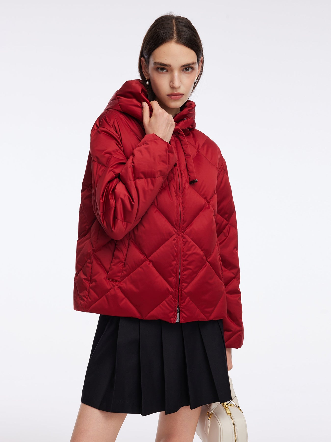 This jacket features a cocoon silhouette enhanced by diamond quilting that adds subtle texture while keeping the profile smooth and contemporary. The drawstring hood adjusts cleanly for added coverage, and the dual-way front zipper supports flexible styling without disrupting the streamlined look. Soft interior pocket linings offer a gentle touch while maintaining practicality, and the overall shape balances light volume with a refined winter presence. Ideal for cold-weather dressing, it delivers a composed blend of structure, warmth, and modern design.