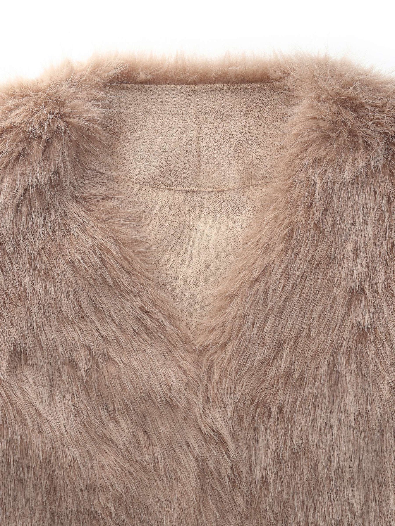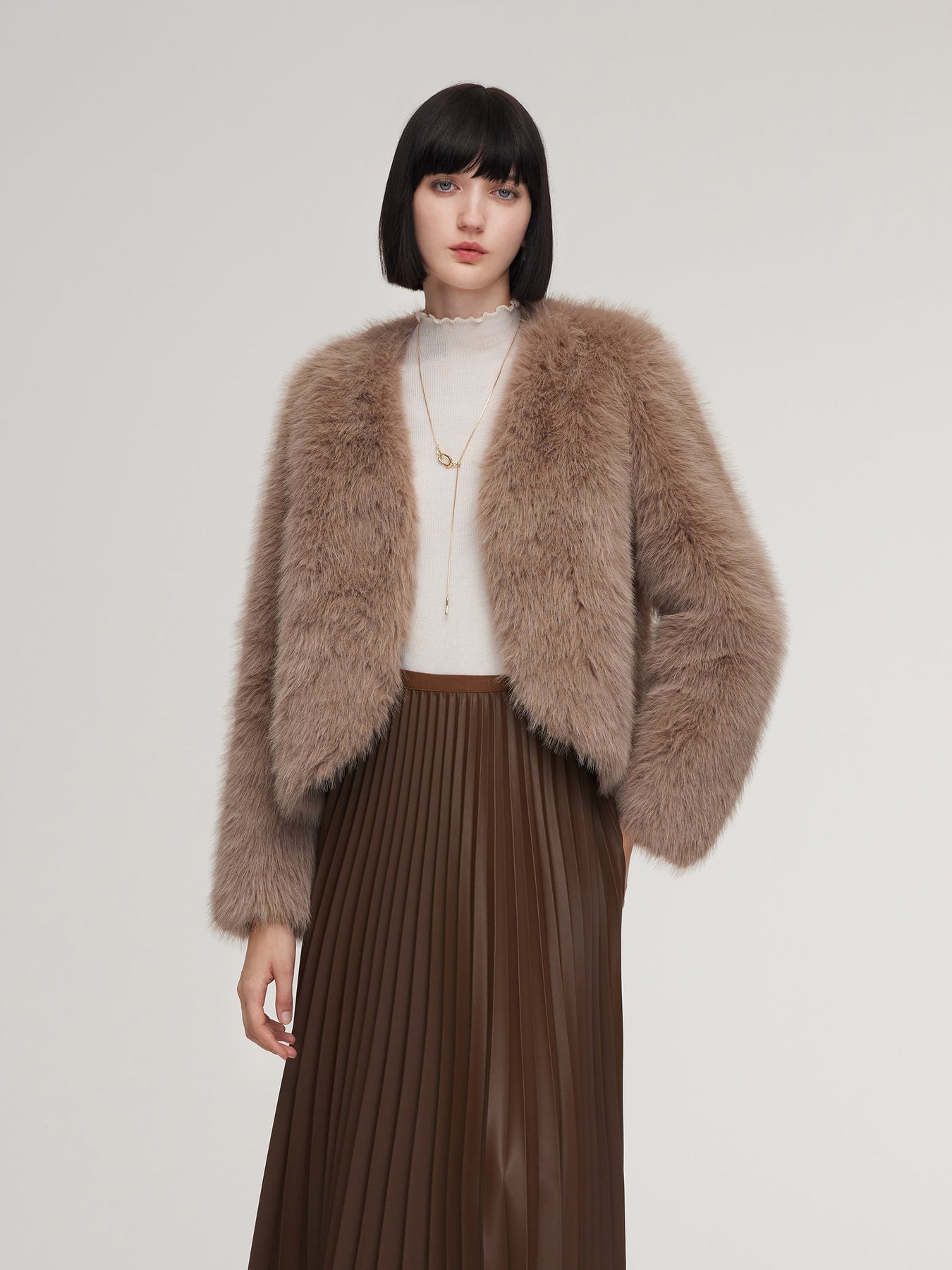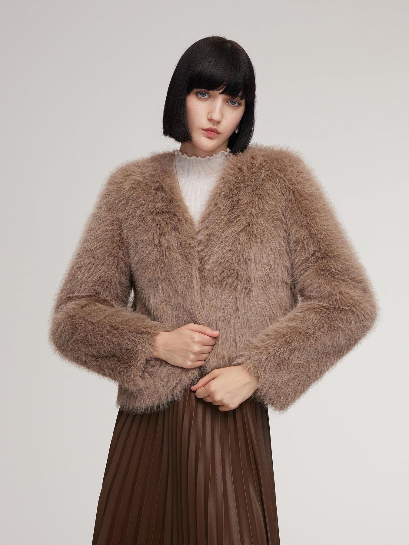 This coat features a plush, textured surface that creates a naturally full silhouette while maintaining a smooth, refined shape. The V-neck opens the profile for a balanced, waist-accentuating look, complemented by the cropped length that adds gentle structure. Side pockets blend neatly into the design, offering function without interrupting the coat’s streamlined appearance. Ideal for cool-weather styling, it delivers a composed mix of softness, shape, and everyday versatility.