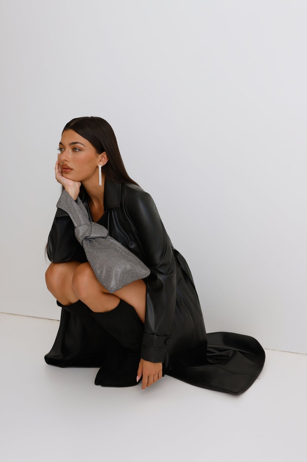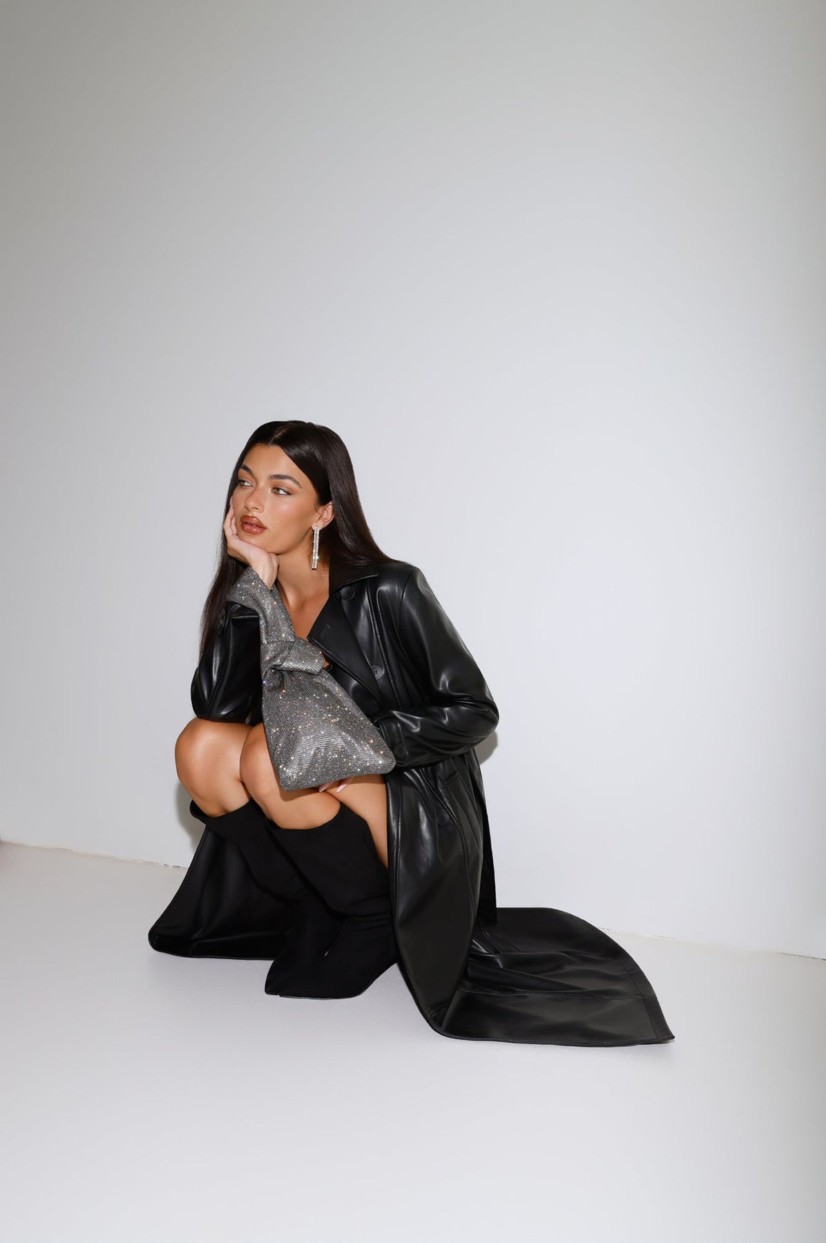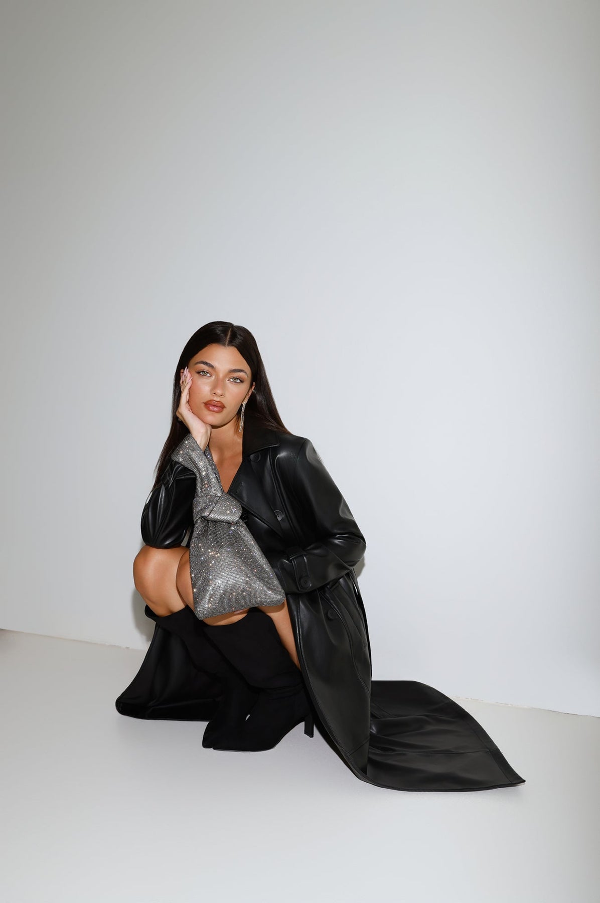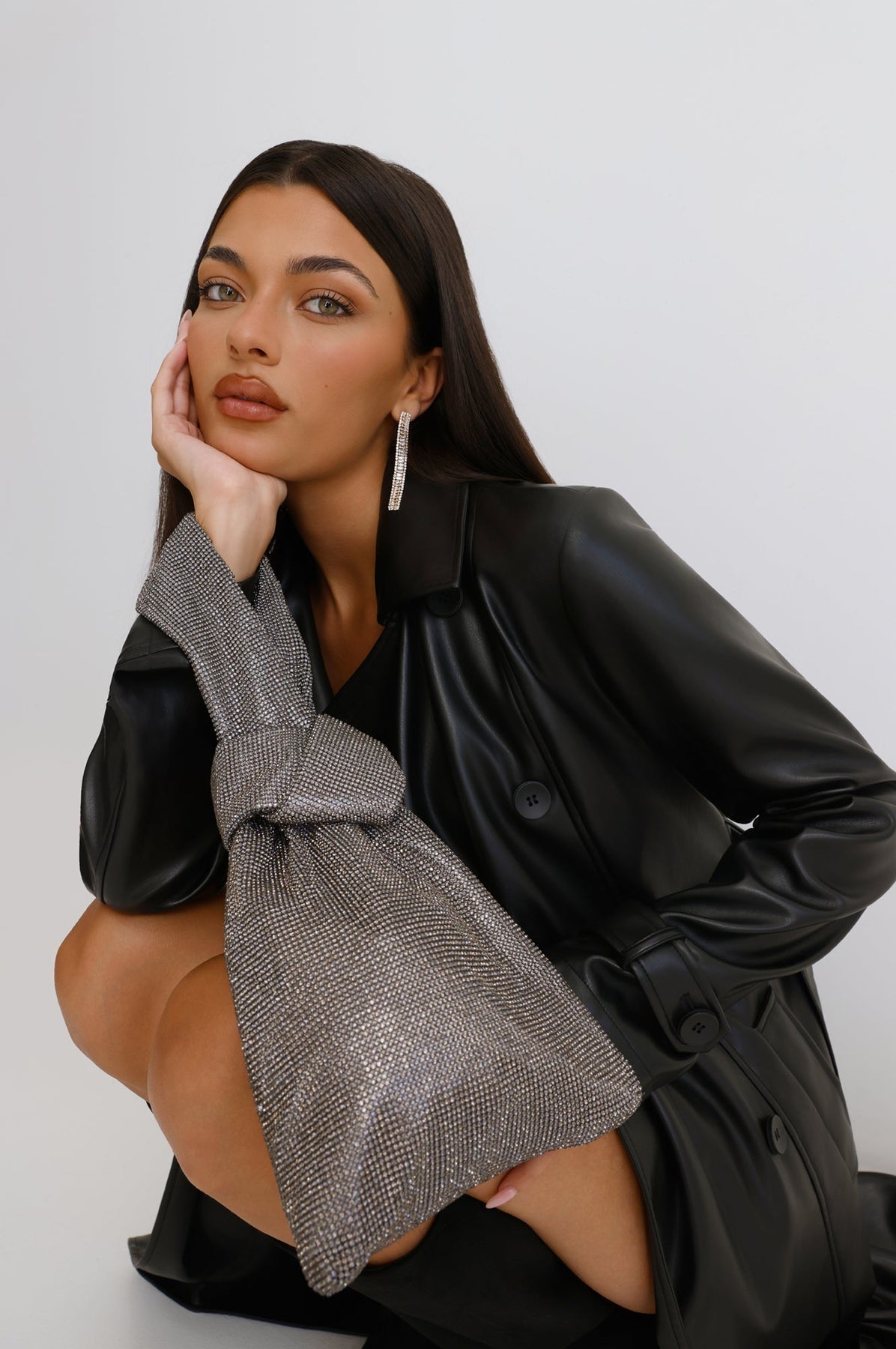 This wristlet bag is designed to dazzle with its shimmering rhinestone exterior and sleek silhouette. A chic gunmetal hardware detail adds a touch of edge, while the practical side zipper keeps your essentials secure. Compact yet eye-catching, this wristlet is perfect for evenings where you want to shine. Its unique knotted handle design makes it both trendy and functional. The perfect finishing touch to elevate any night-out look.