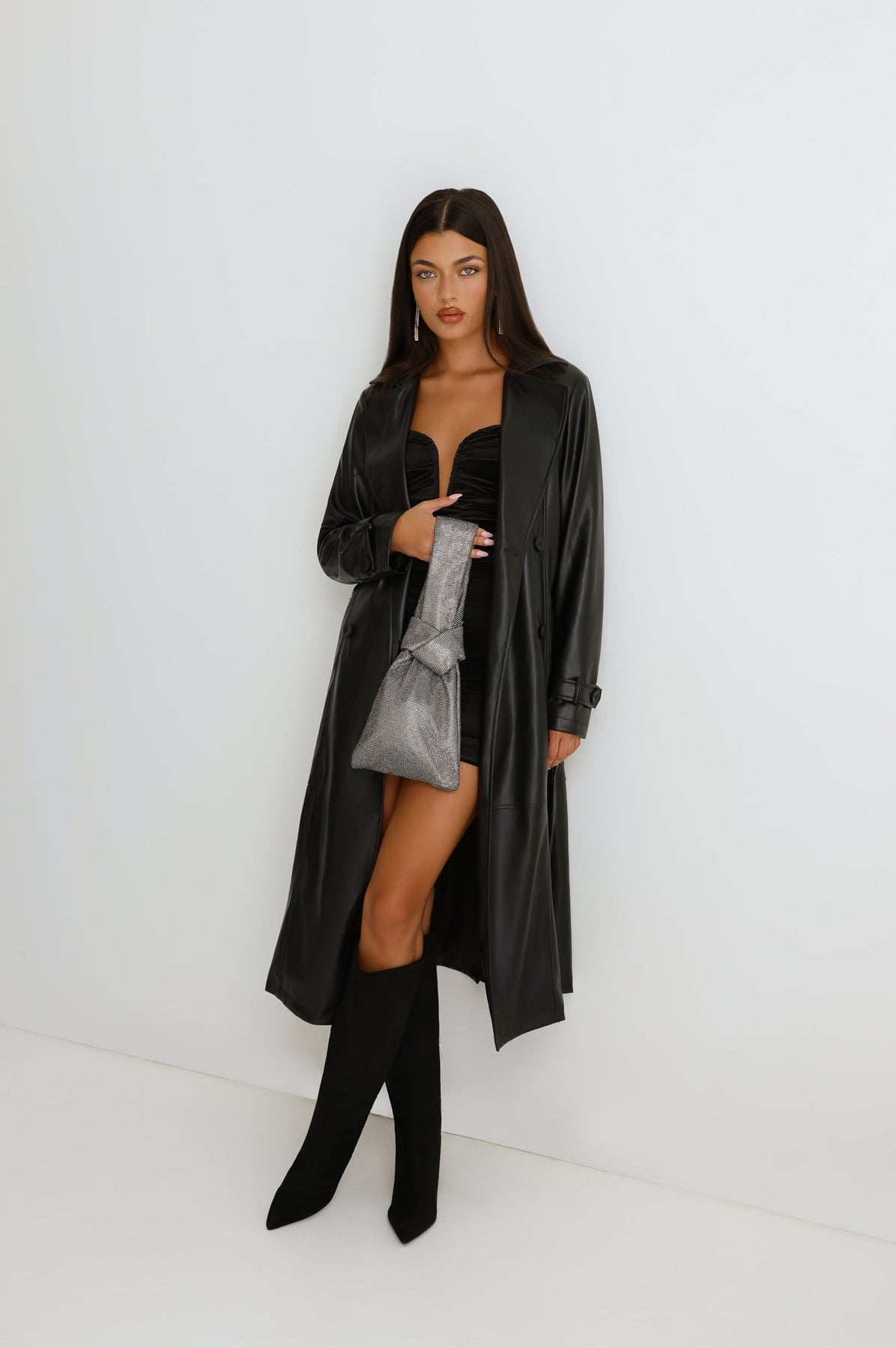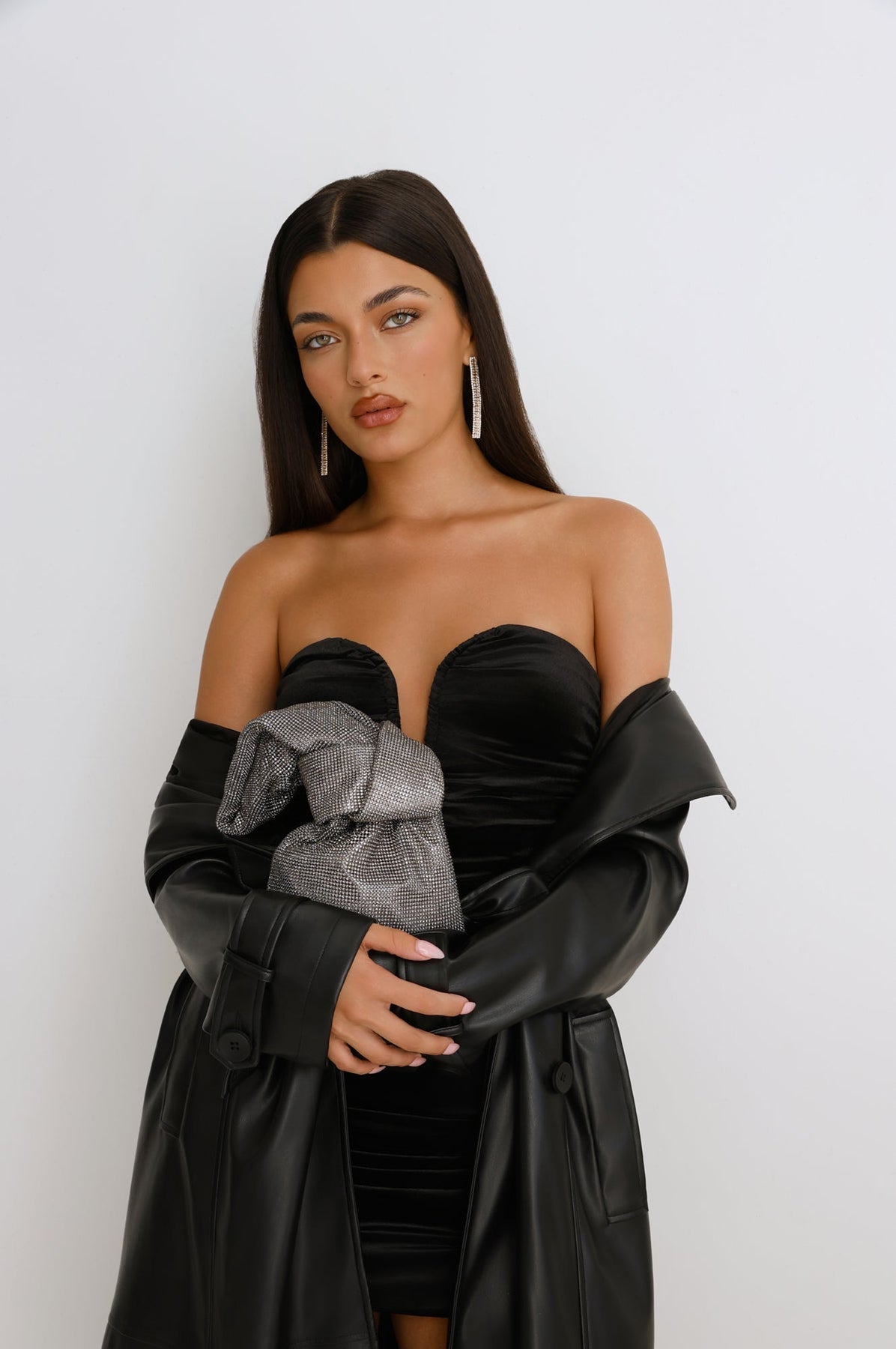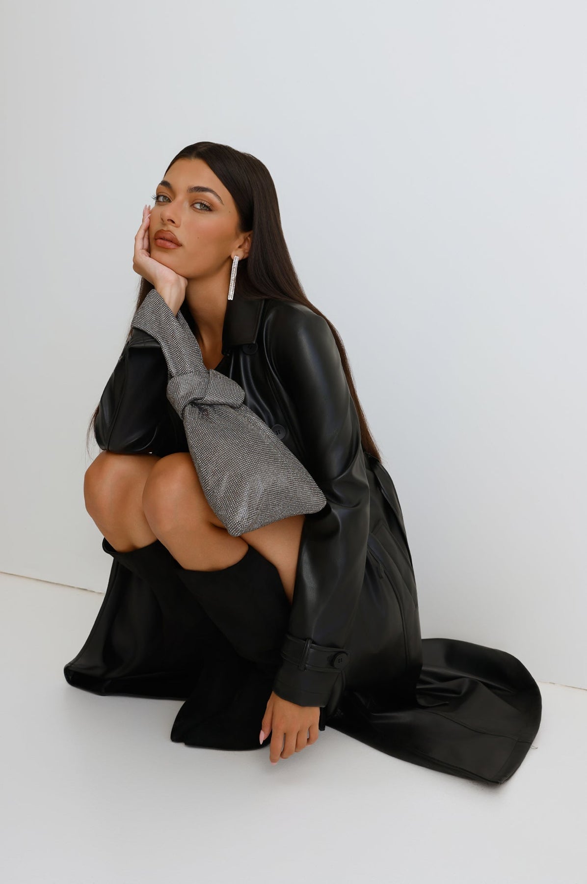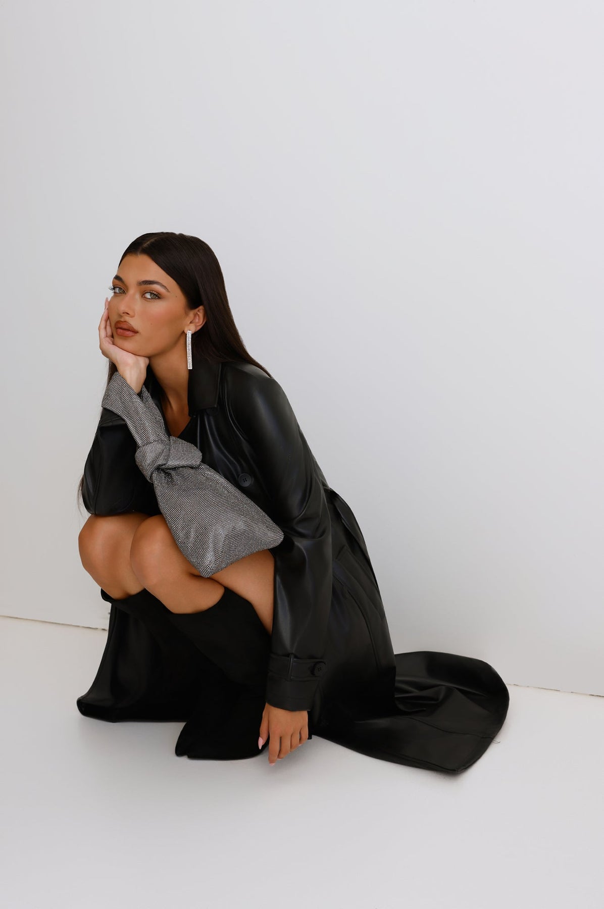 This wristlet bag is designed to dazzle with its shimmering rhinestone exterior and sleek silhouette. A chic gunmetal hardware detail adds a touch of edge, while the practical side zipper keeps your essentials secure. Compact yet eye-catching, this wristlet is perfect for evenings where you want to shine. Its unique knotted handle design makes it both trendy and functional. The perfect finishing touch to elevate any night-out look.