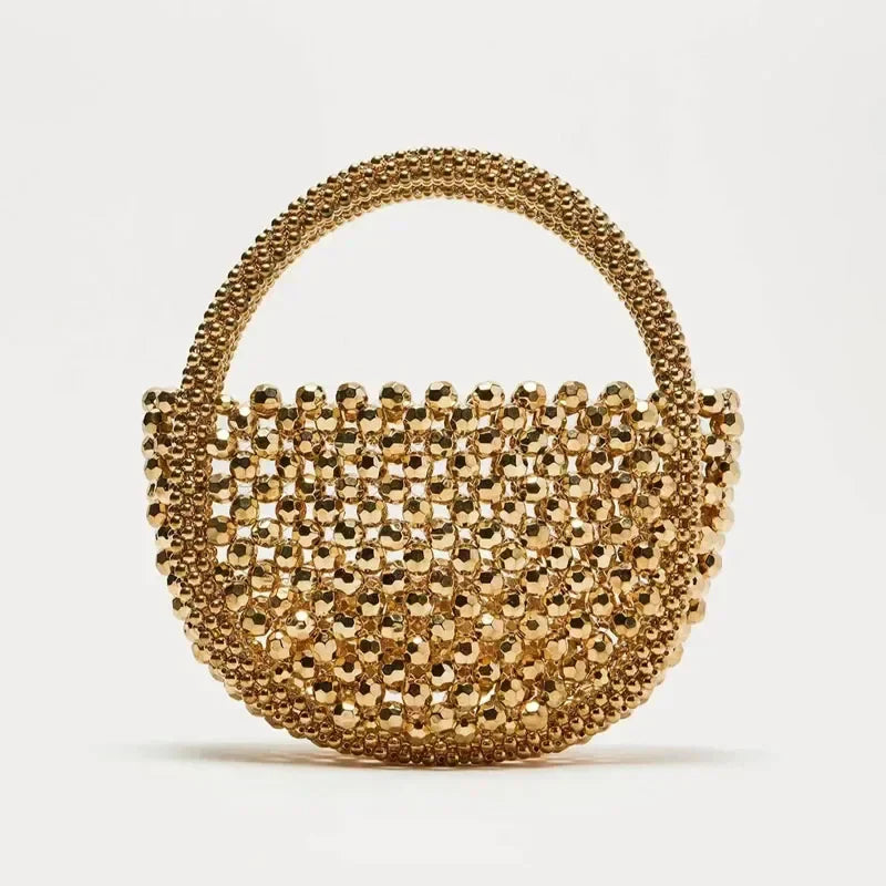 This women’s handbag is crafted with faceted beads that reflect light from every angle, creating a striking visual effect. Its sculptural silhouette is both distinctive and balanced, designed to stand out while remaining functional. A rounded halo handle offers structure and comfort for easy carrying. Available in two shades, the bag adapts effortlessly to both casual and polished outfits. A statement accessory that blends artful detail with everyday usability.