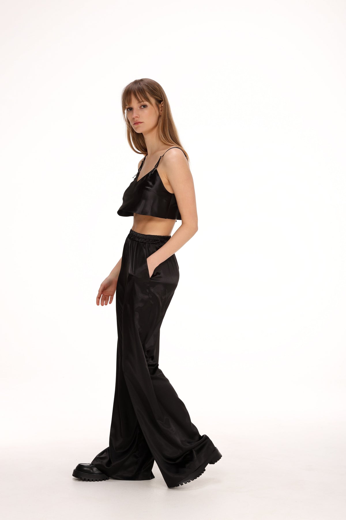 These women’s satin trousers blend comfort with sophisticated ease, designed in a lustrous fabric that drapes fluidly for a flattering silhouette. The elastic waistband offers a secure yet flexible fit, while side pockets provide subtle functionality without disrupting the sleek design. With a relaxed cut, they transition seamlessly from daytime wear to evening occasions. Minimalistic yet striking, these trousers embody understated elegance.